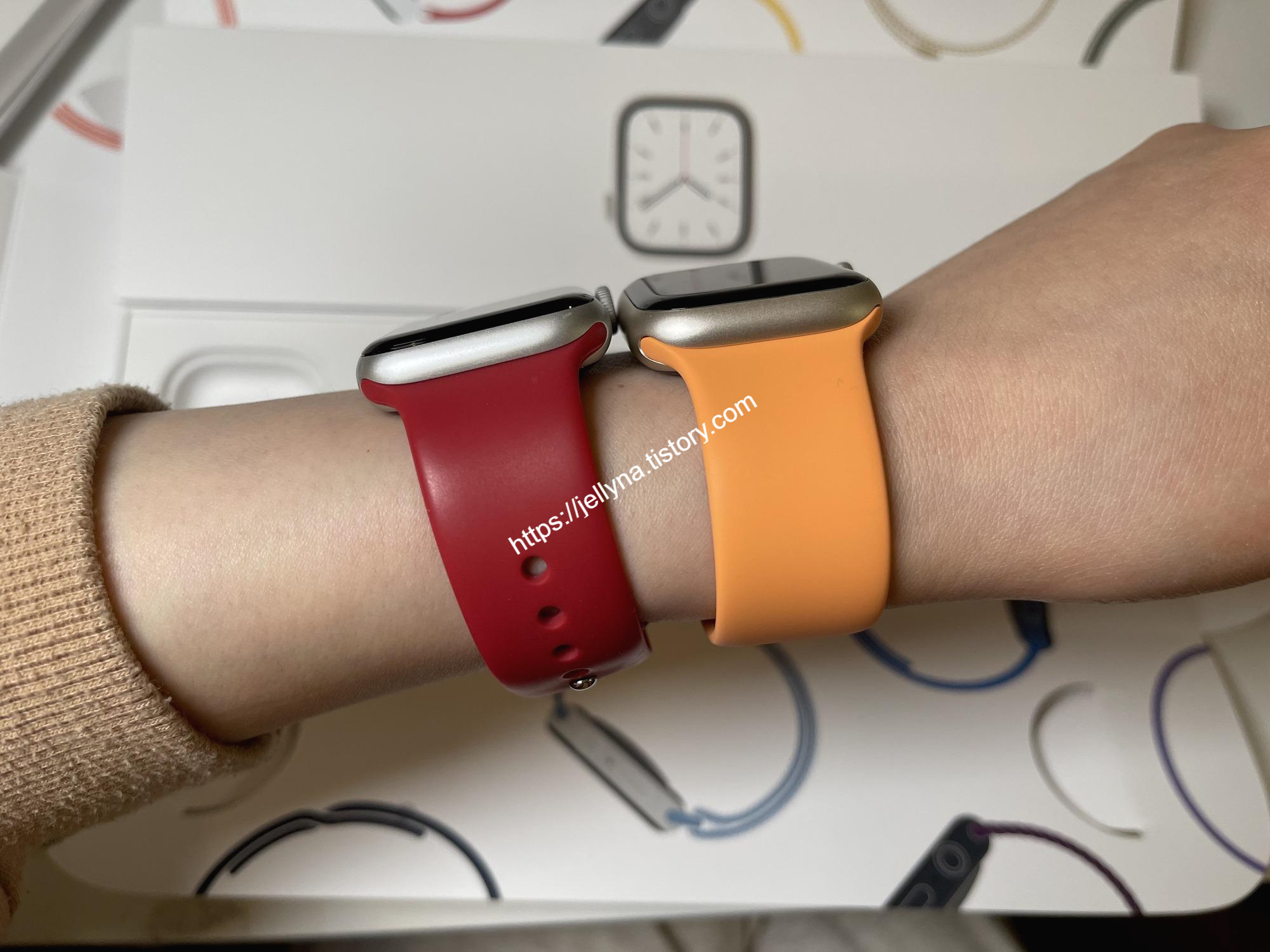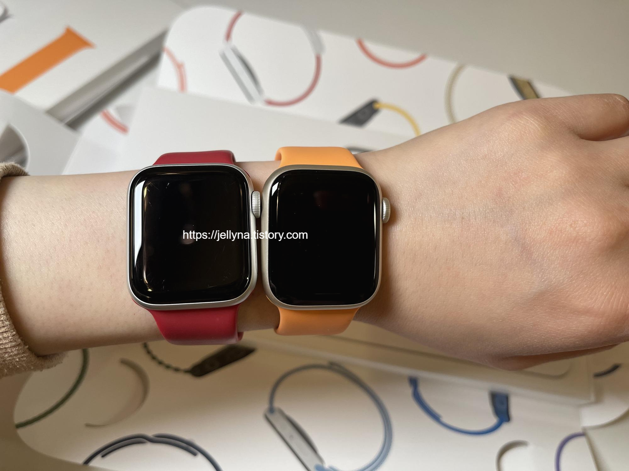 직접 눈으로 봤을 때는 애플 워치 7 스타라이트가 조금 골드펄 느낌이 들어간 색상인 것 같으나