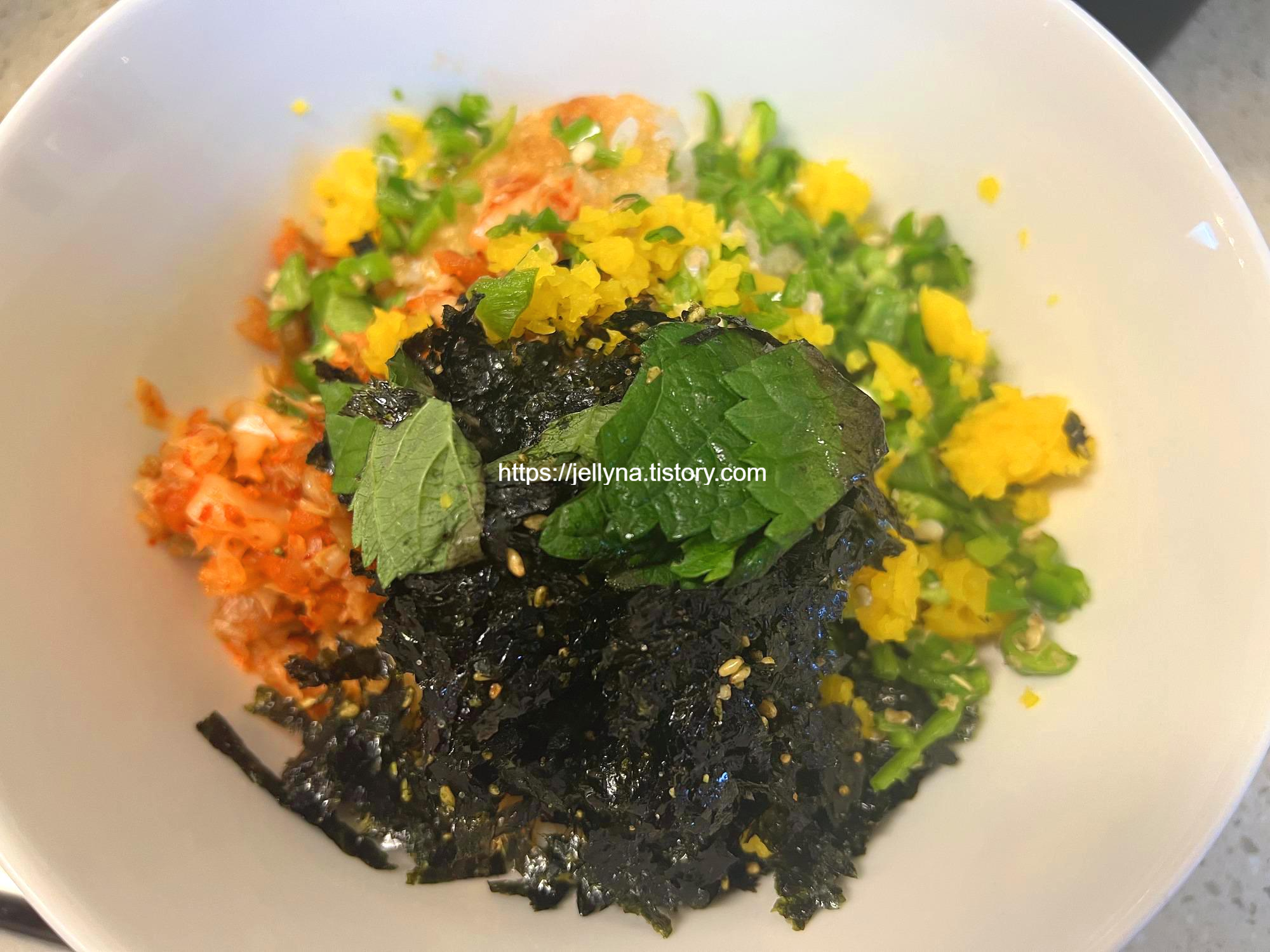 누룽지를 놓고 나머지 재료들과 섞어주면 땡초 누룽지 볶음밥 완성~!